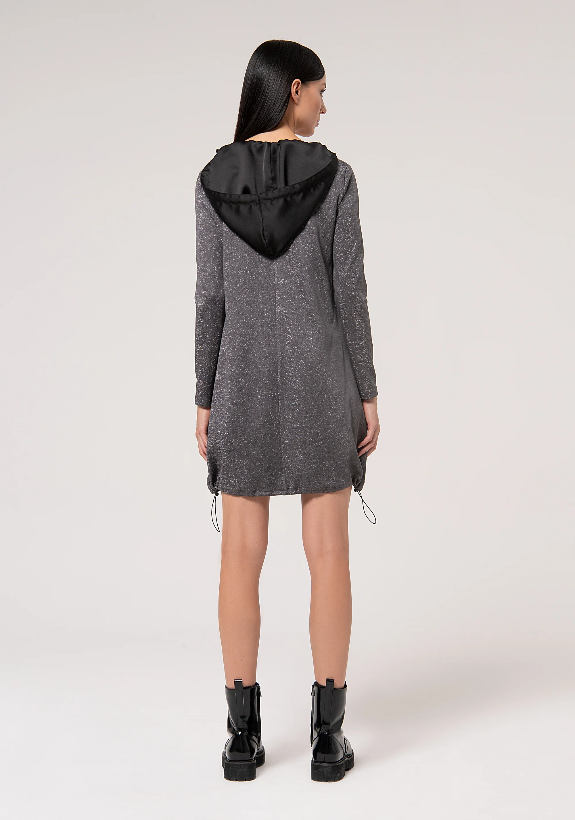 Abito over mini in tessuto effetto metallico, scollo a V con cappuccio, maniche lunghe, e con orlo fondo con coulisse.