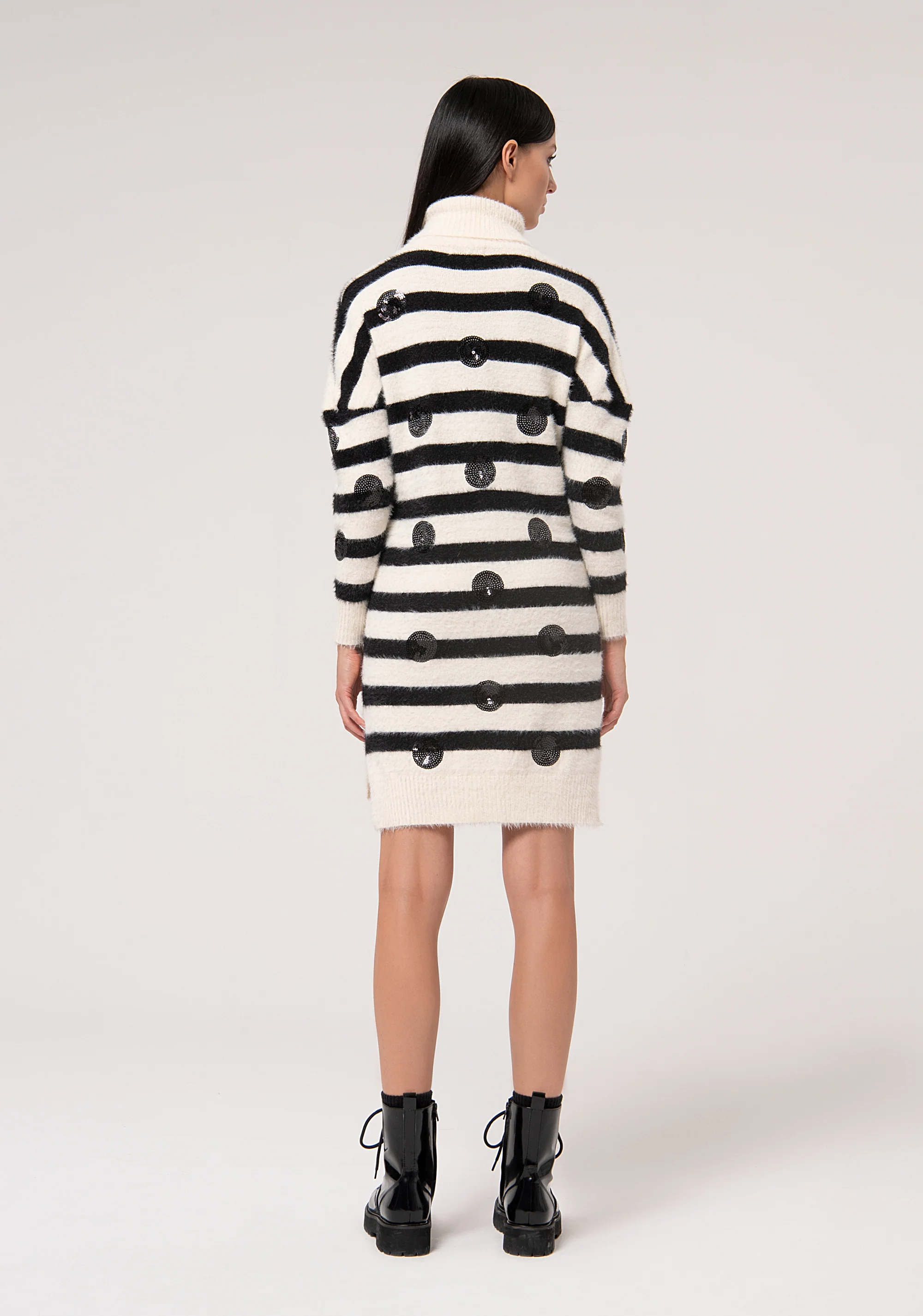 Abito regular mini in maglia a righe, applicazioni di paillettes, collo alto, e con maniche lunghe.
