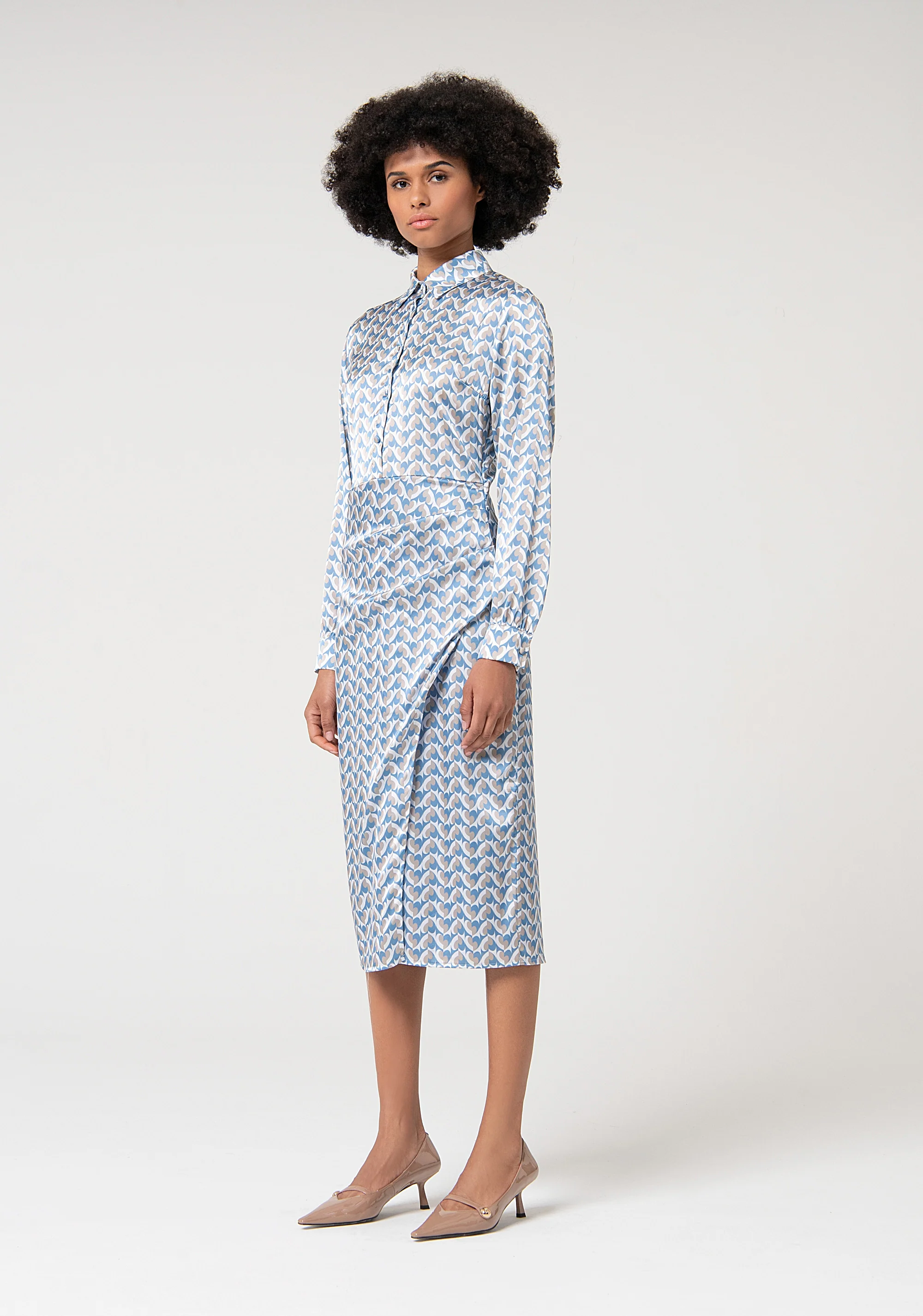 Abito regular modello chemisier midi in fantasia geometrica, colletto classico, bottoni centrali per apertura, taglio in vita, arricci laterali sui fianchi, e con maniche lunghe.