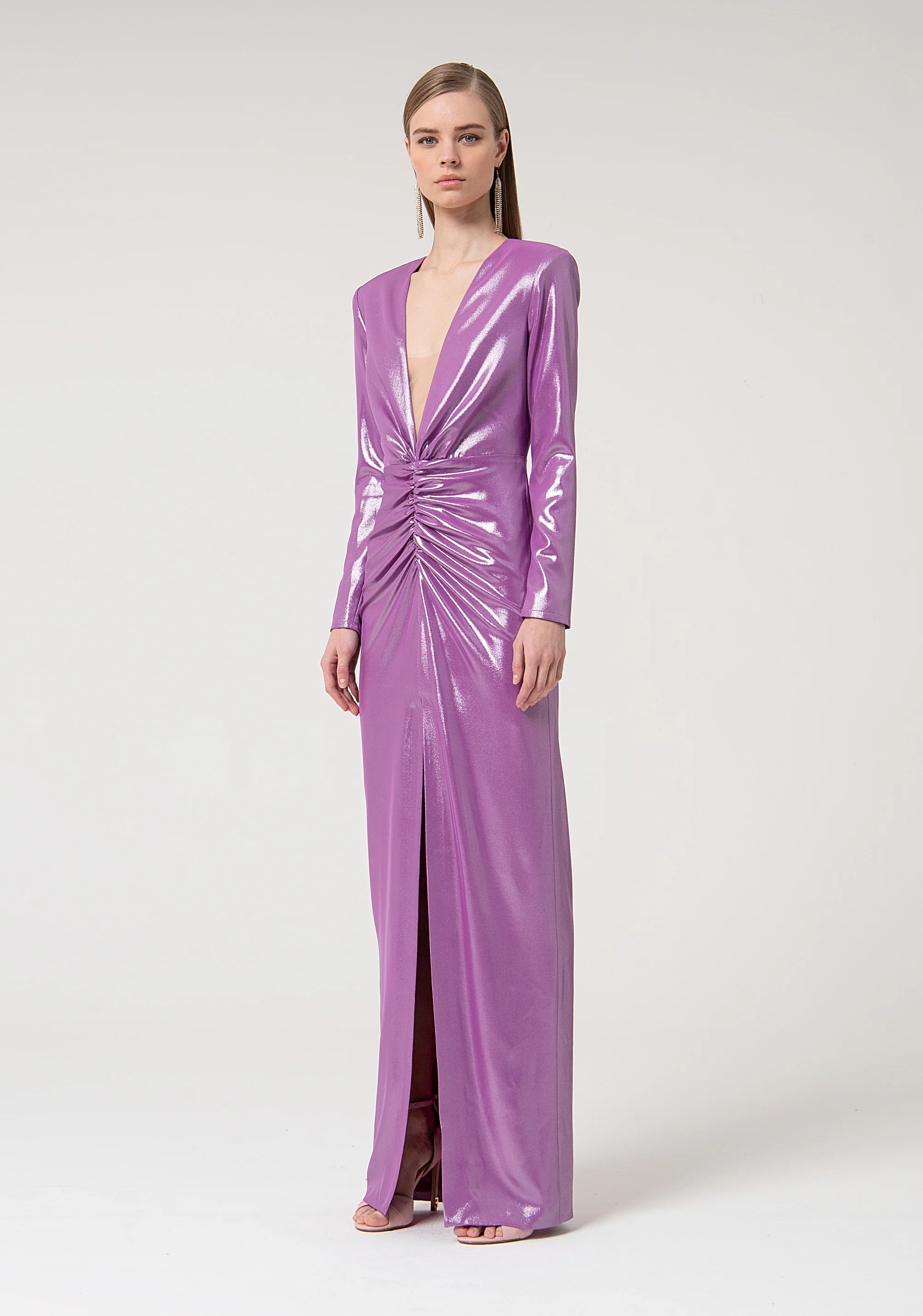 Abito slim lungo in tessuto lucido, scollo a V profondo, taglio in vita con arriccio, spacco sul centro davanti.
