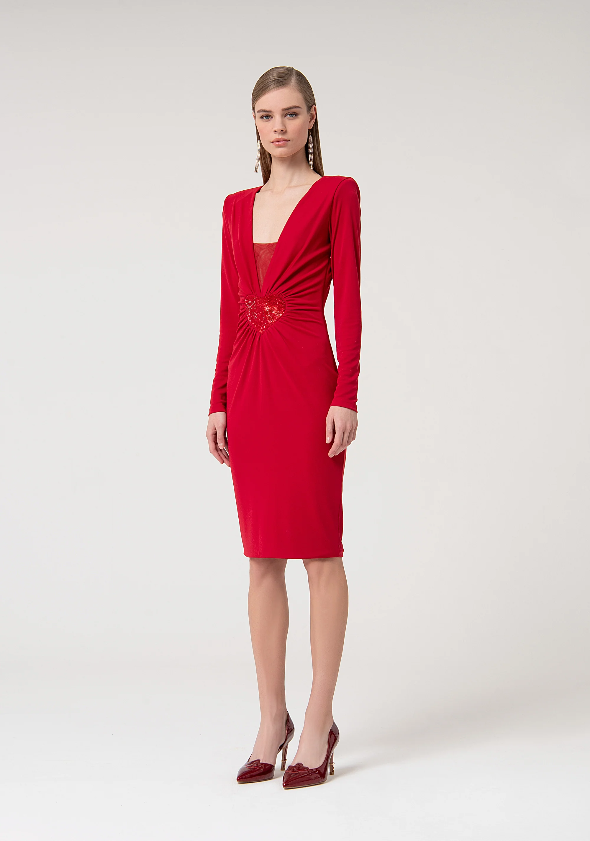 Esalta la tua eleganza con l'Abito slim midi con patch cuore in paillettes. Il suo design unico vanta uno scollo a V profondo con arricciatura e inserto in pizzo, insieme alle maniche lunghe, per un look sofisticato. Aggiungi un tocco di brillantezza al tuo guardaroba con i patch cuore in paillettes.