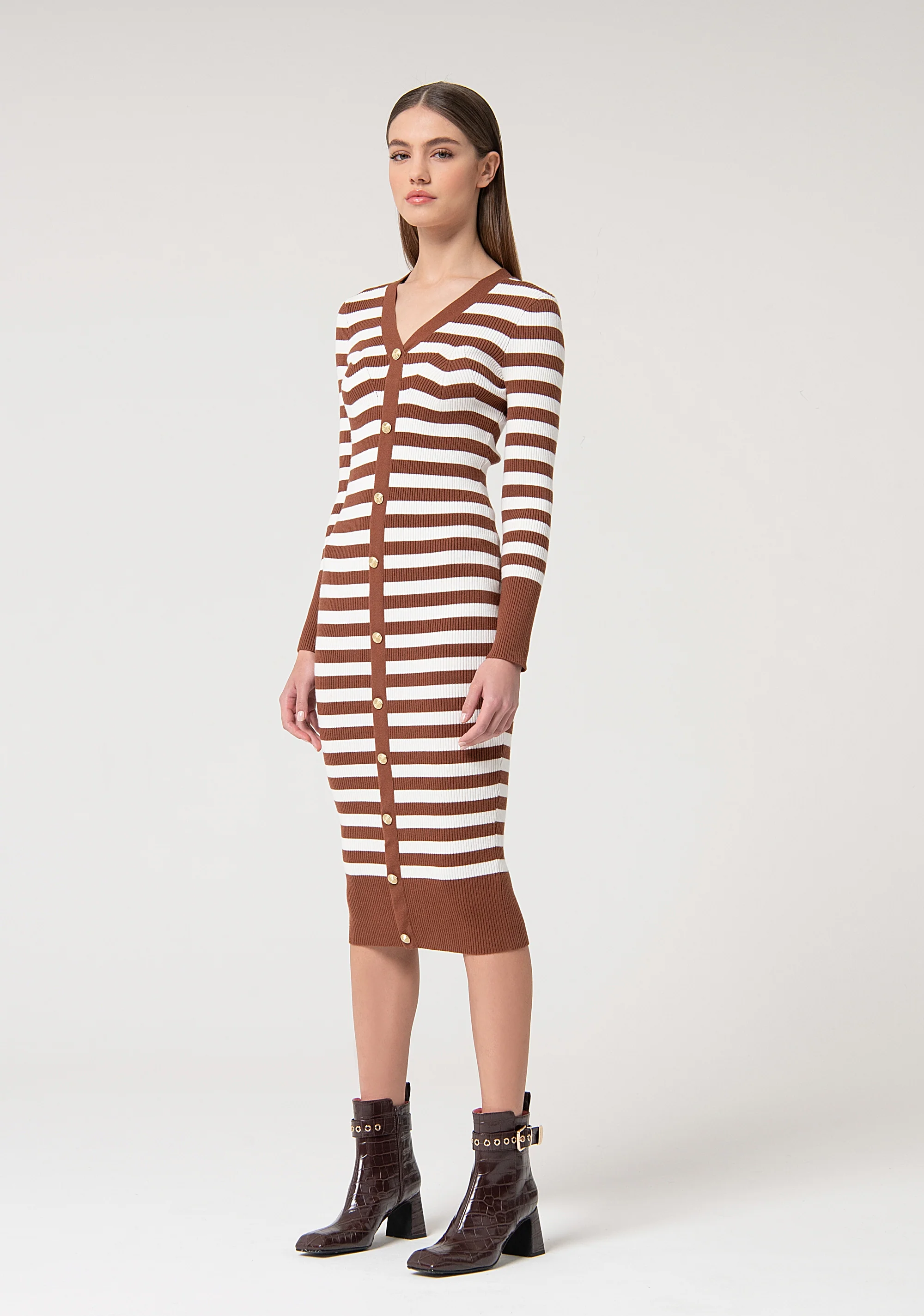 Abito slim midi in maglia a righe, scollo a V, bottoni centrali, e con maniche lunghe.