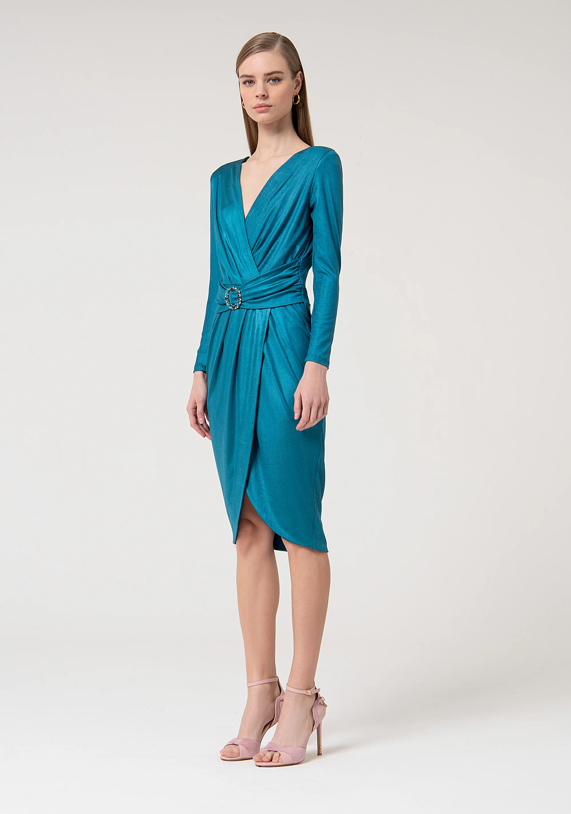 Abito slim midi in tessuto lucido, scollo ad incrocio, fusciacca in vita, e con gonna a portafoglio.