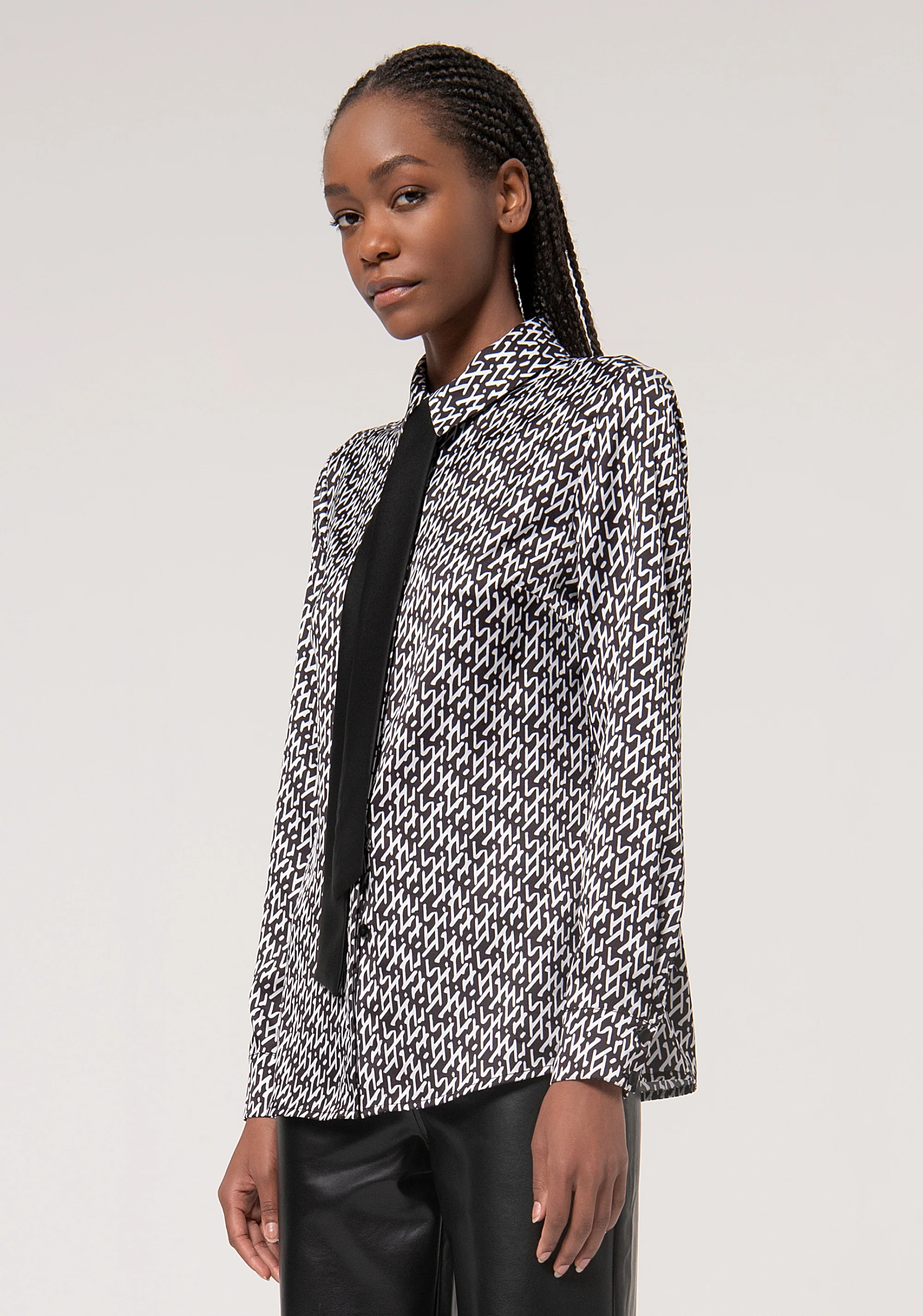 Camicia regular in fantasia astratta, colletto classico con cravatta abbinata, bottoni centrali per apertura, e con maniche lunghe.
