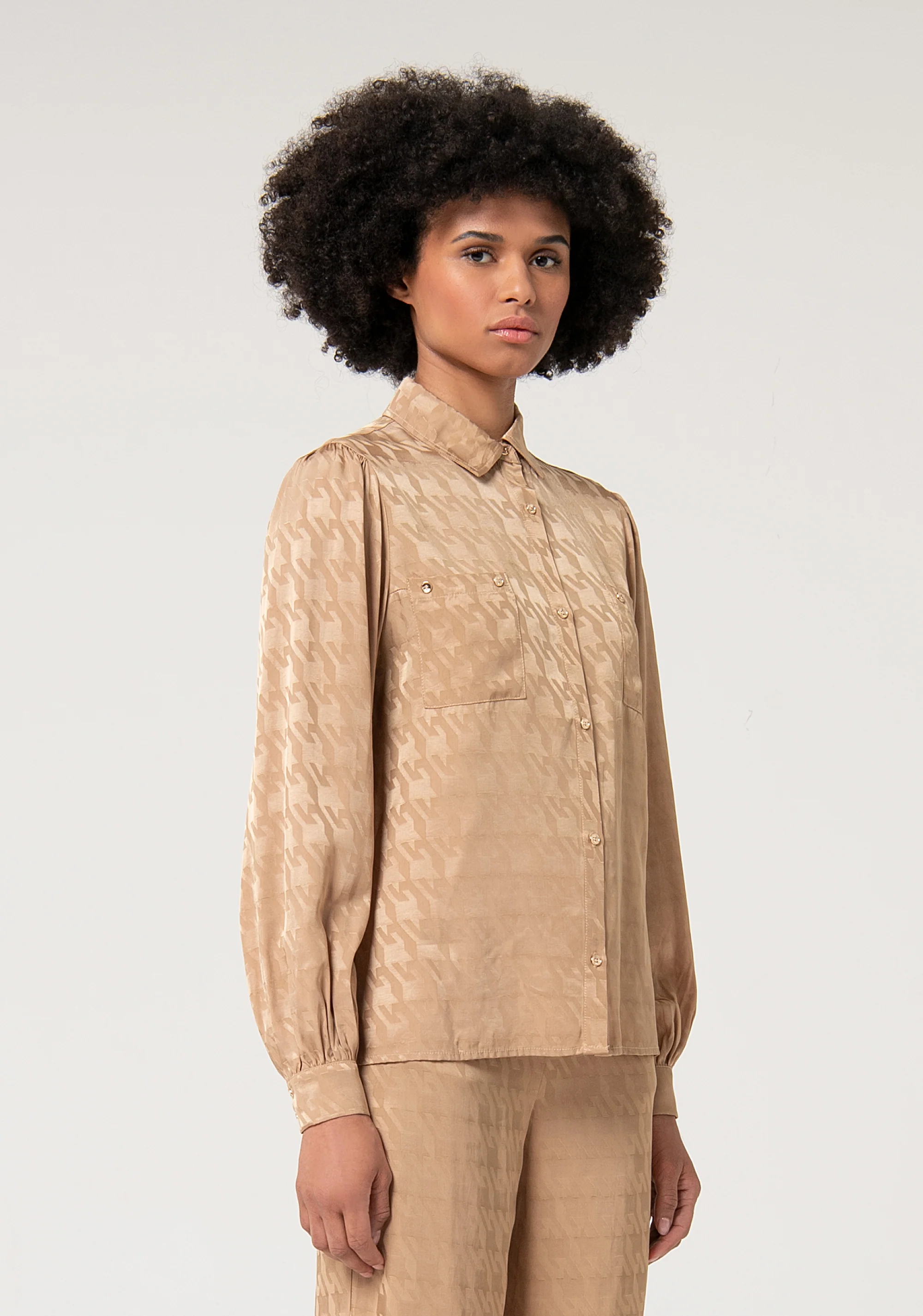 Camicia regular in fantasia, colletto classico, bottoni centrali per apertura, tasche applicate, e con maniche lunghe.