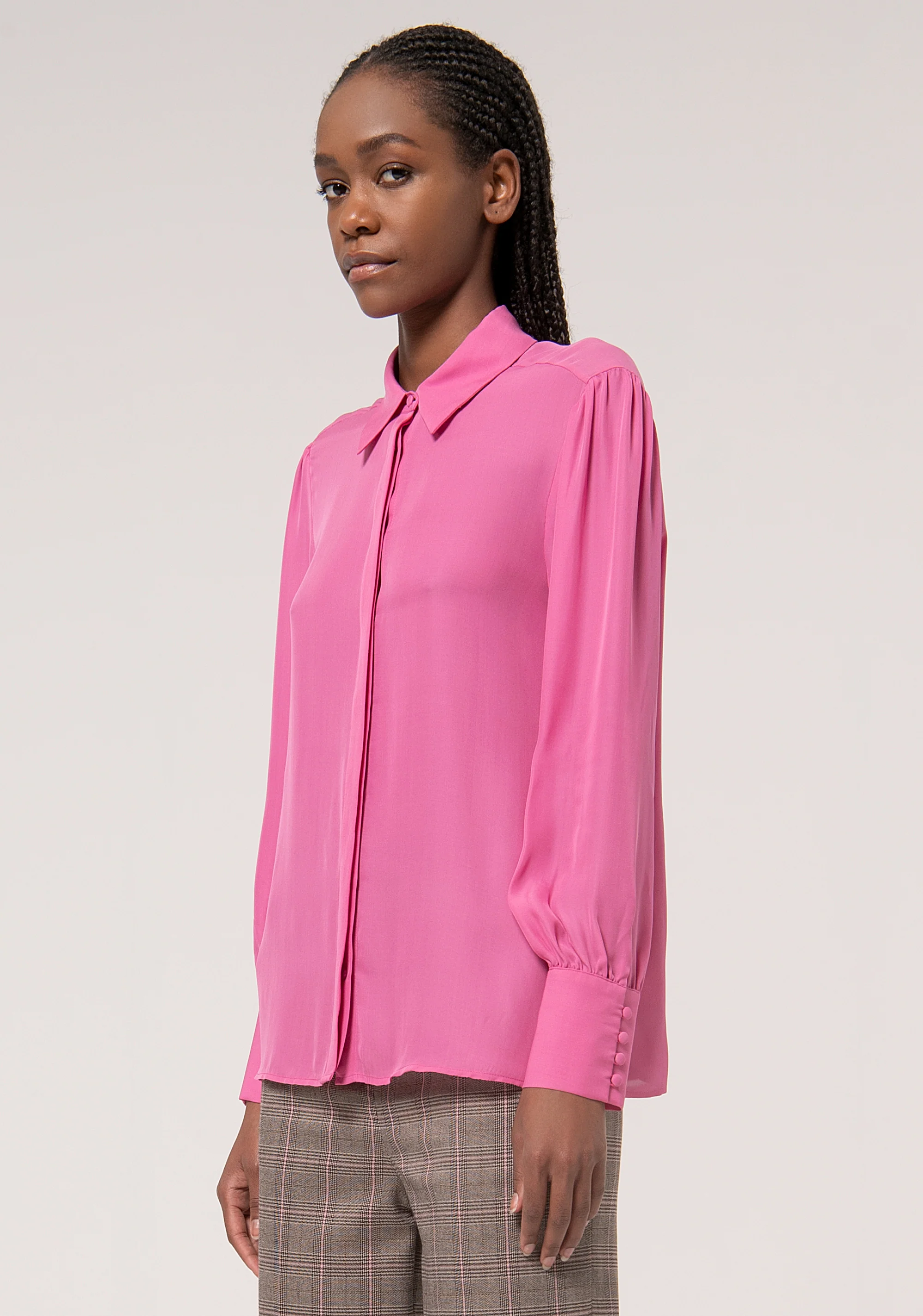 Camicia regular in viscosa e seta, colletto classico, bottoni nascosti per apertura, e con maniche lunghe.