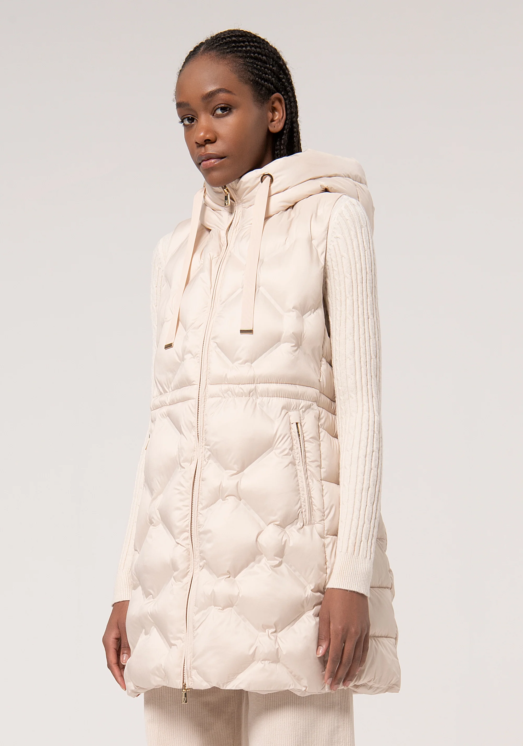 Giacca senza maniche imbottita, con cappuccio, zip centrale per apertura, e con tasche laterali.