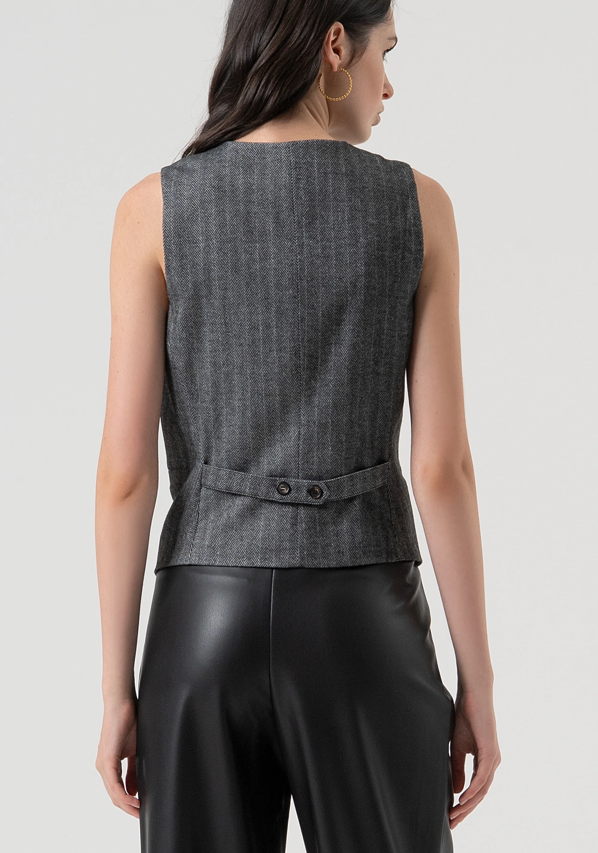 Gilet regular in tessuto gessato, scollo a V, bottoni per apertura, e con tasche a filetto.