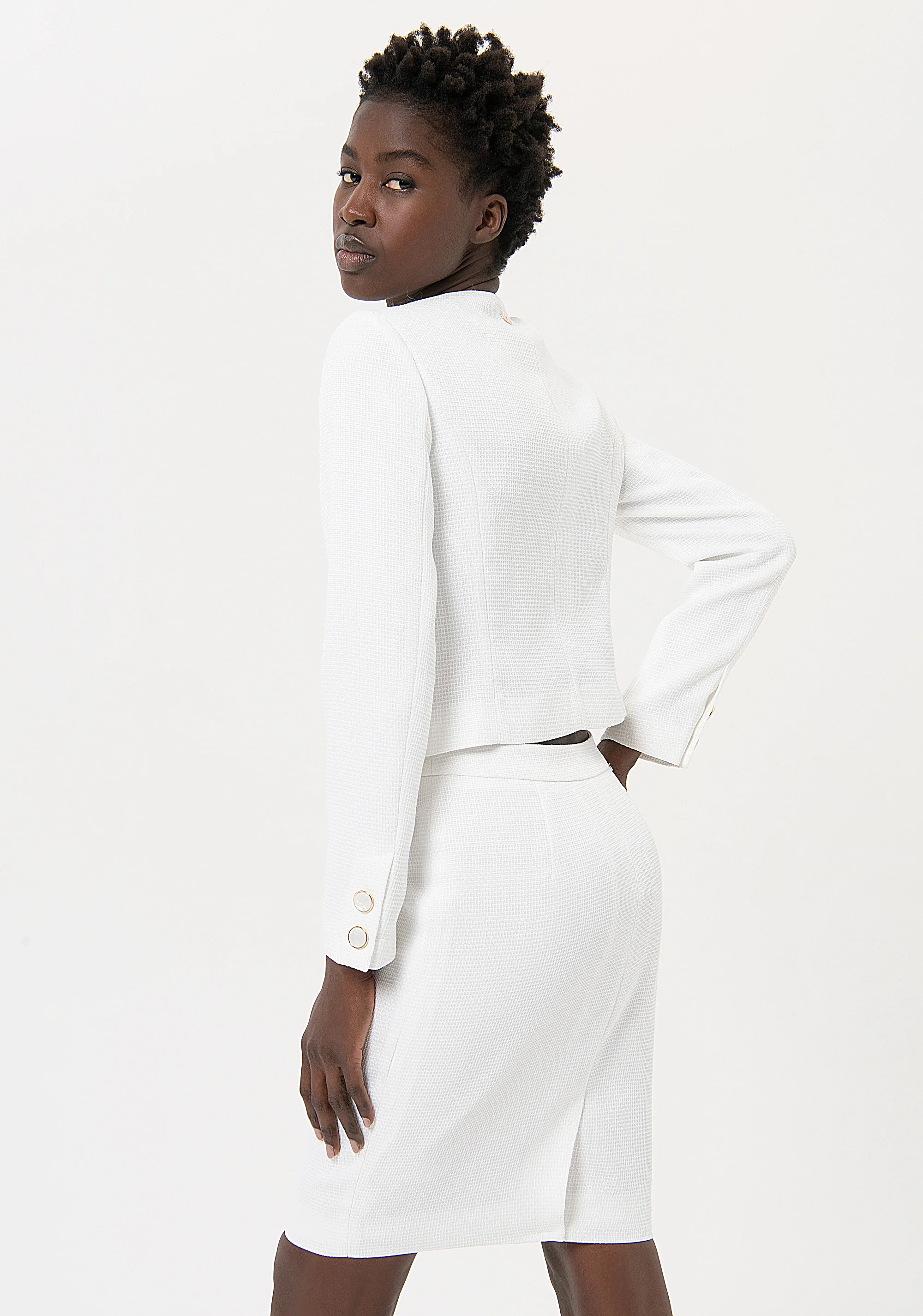 Gonna slim midi a tubino, vita alta, bottoni applicati sul davanti, e con spacco sul centro dietro.
