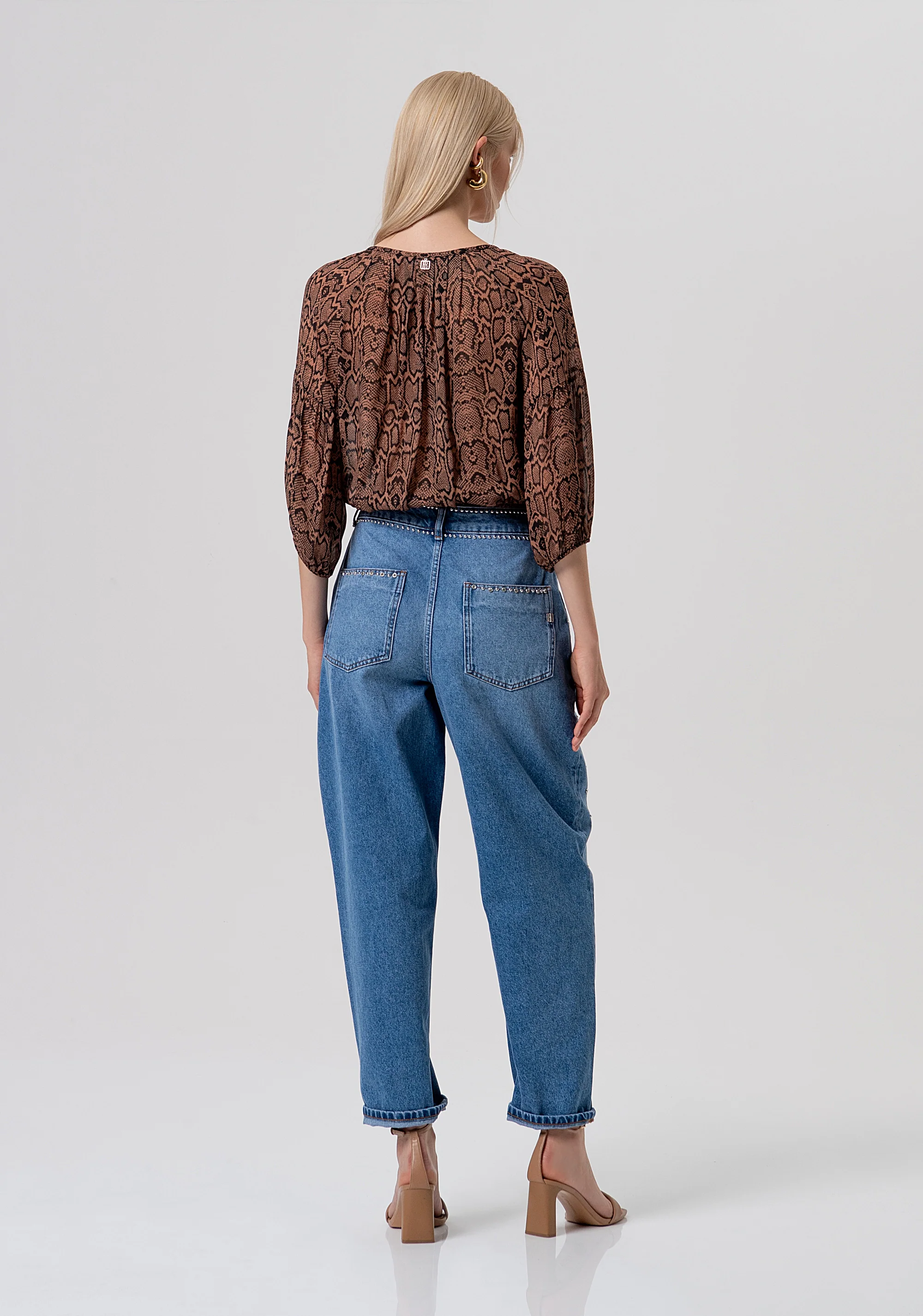 Jeans carrot balloon fit in denim con lavaggio medio ed applicazioni luminose, vita regolare, tasche alla francese davanti, tasche a toppa dietro, e con fondo dritto.