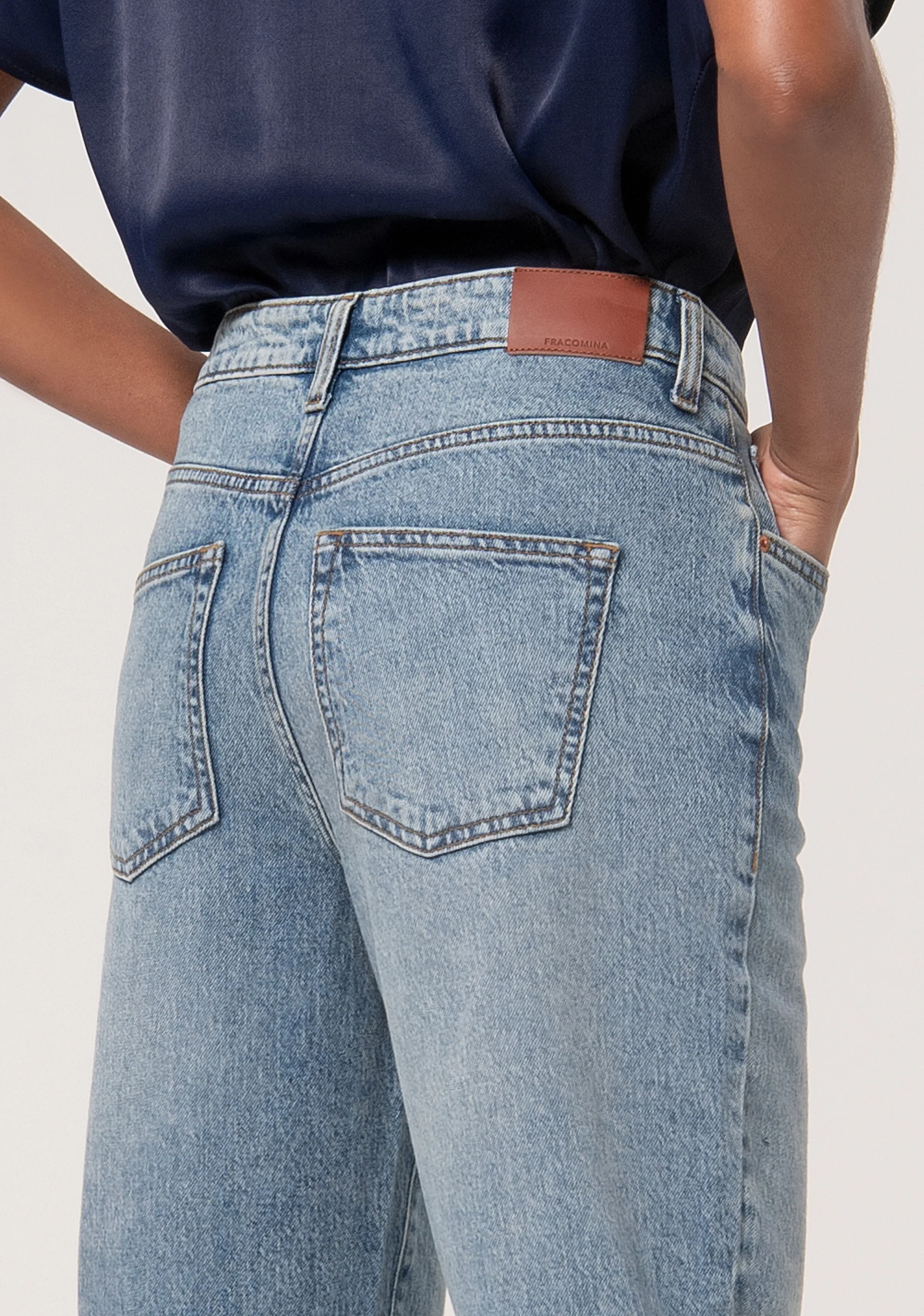 Jeans mom fit carrot in denim con lavaggio nuvolato, vita alta, 5 tasche, e con fondo dritto.