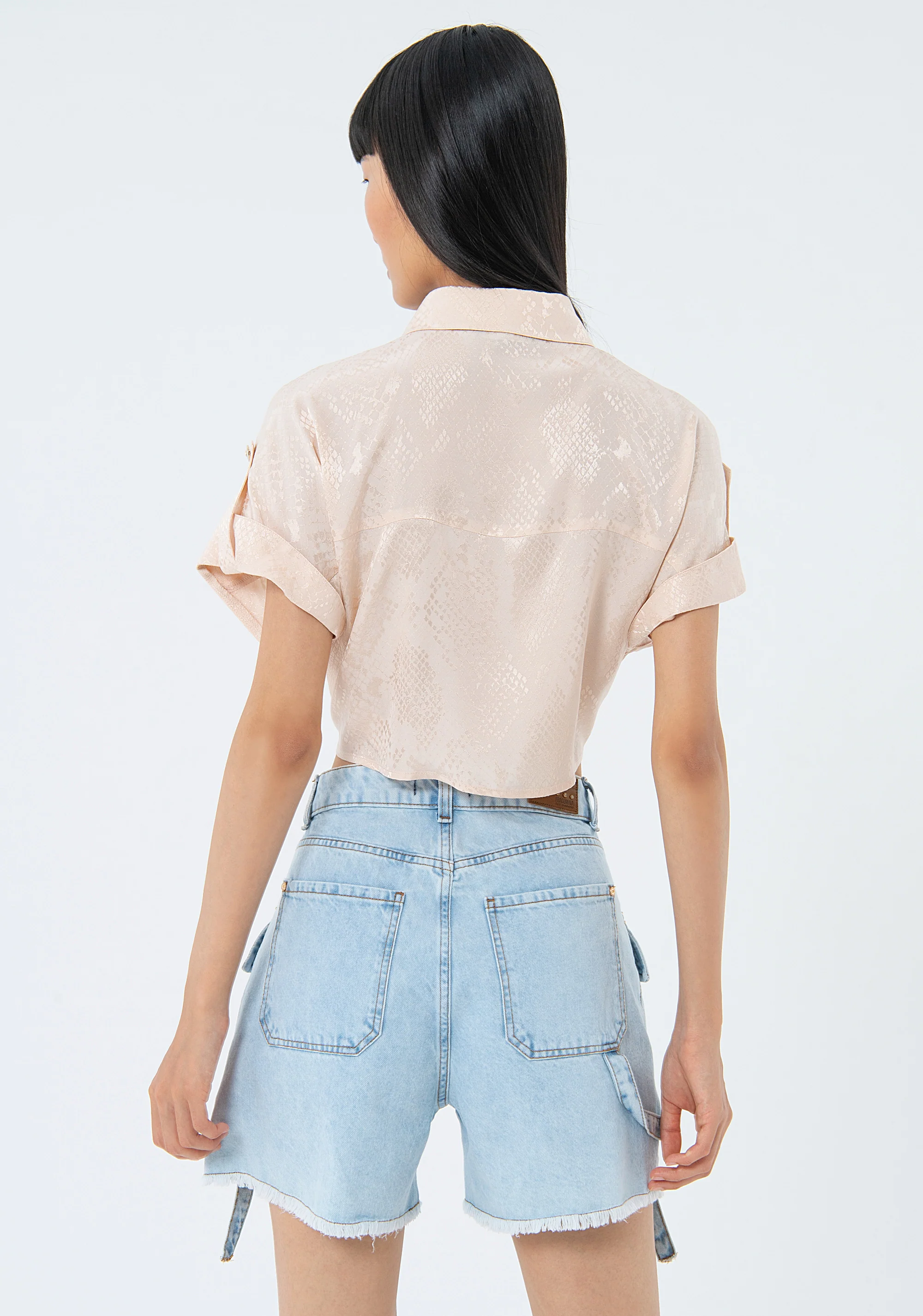 Pantaloncini cargo in denim con lavaggio bleached, vita regolare, tasconi laterali e tasche a toppa sul dietro, e con fondo largo.