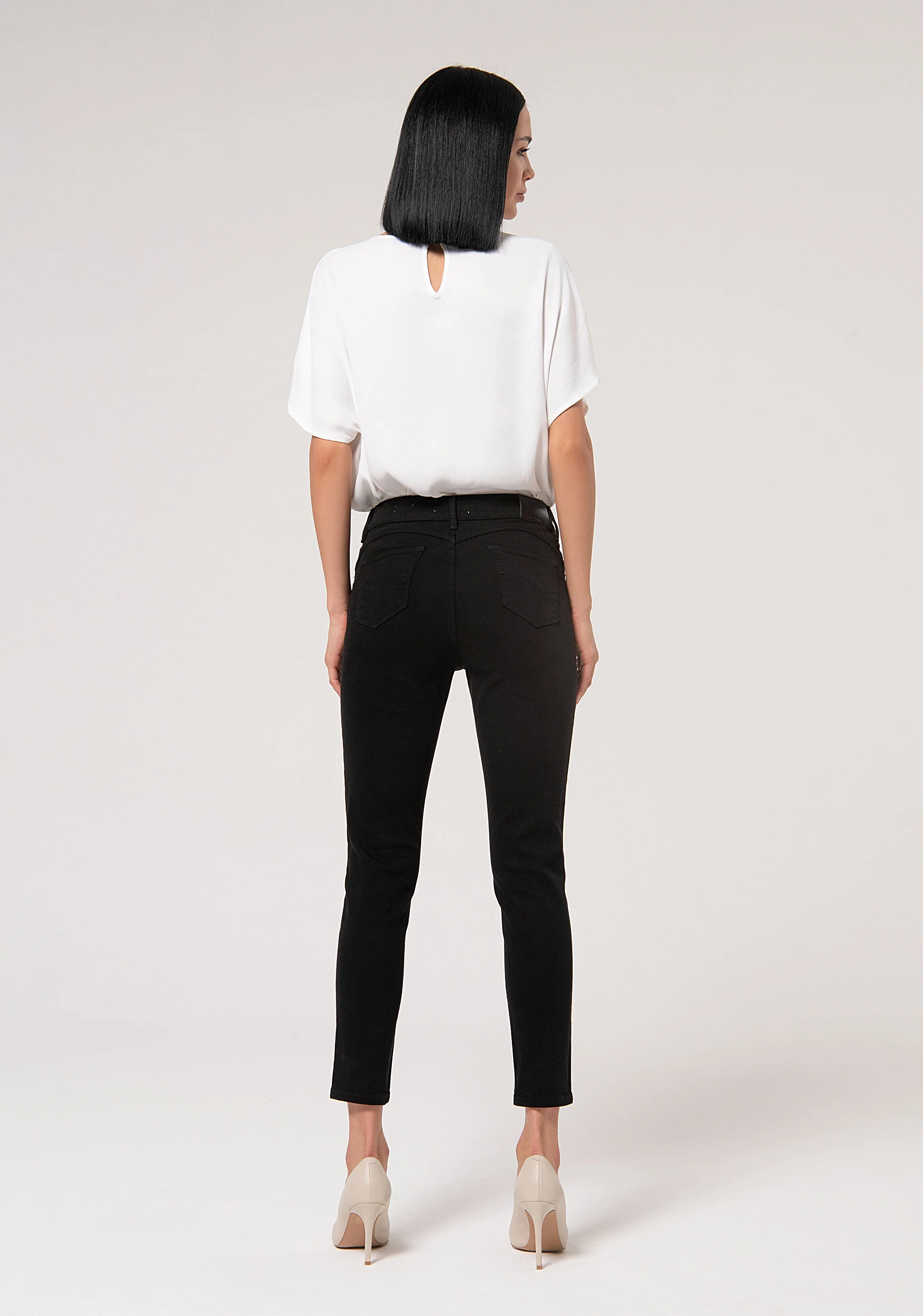 Pantalone slim effetto perfect shape in bull colorato, vita regolare, 5 tasche, e con fondo stretto.