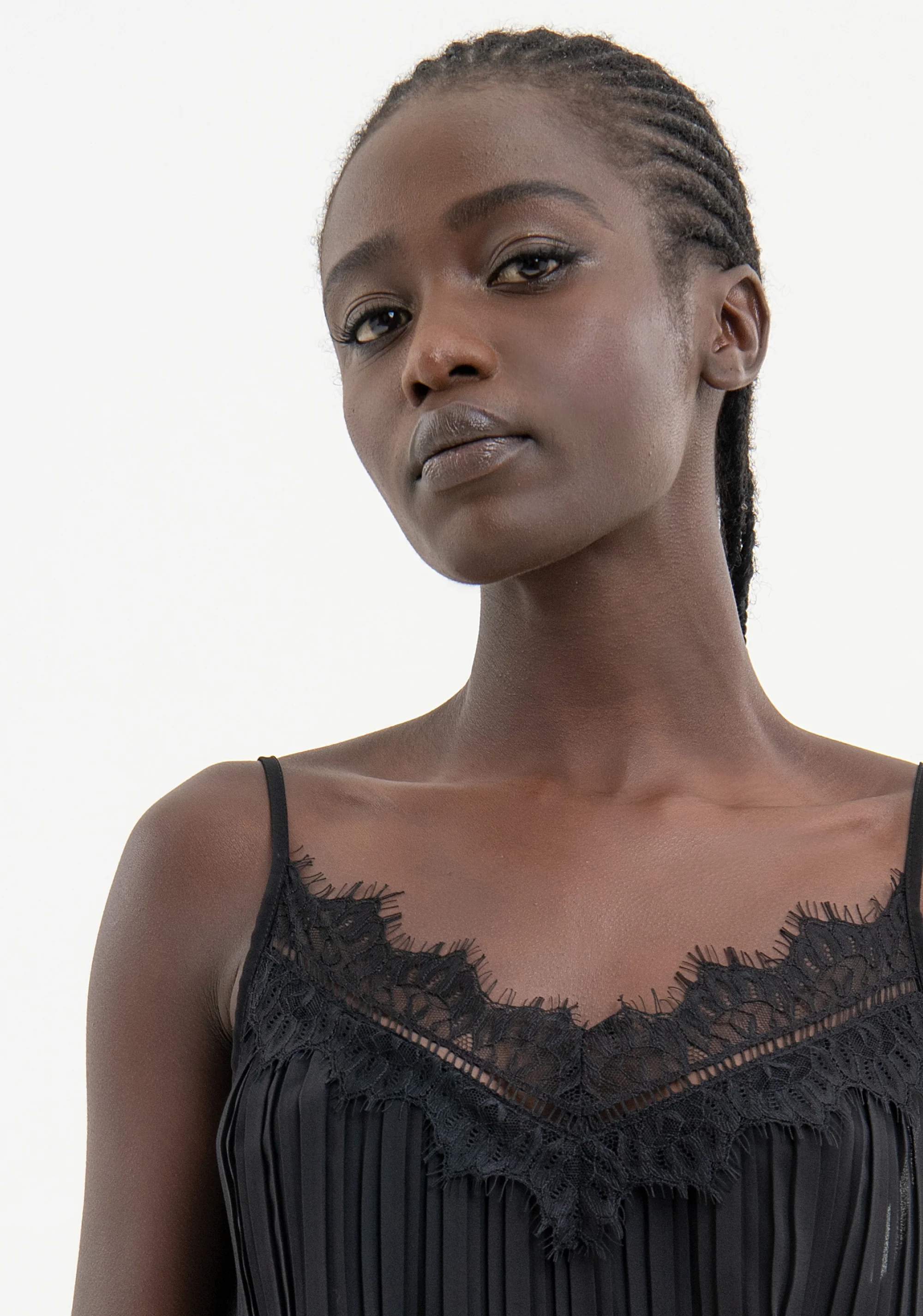Top ampio plissè, scollo a V con passamaneria in pizzo, e con bretelline sottili.